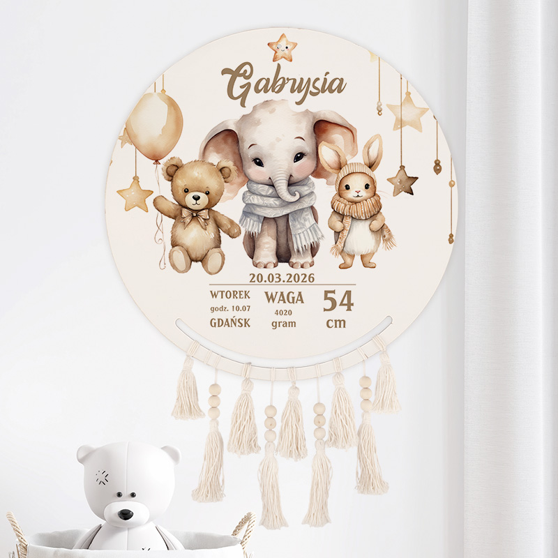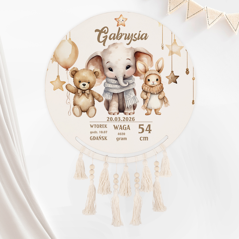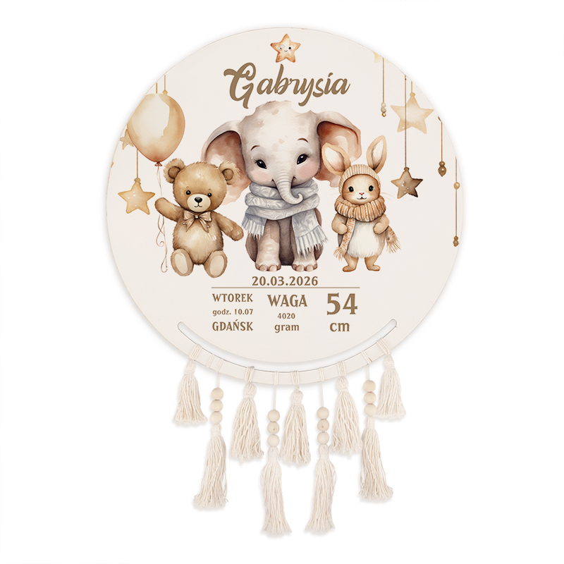 Na okrągłej tarczy łapacza snów znajduje się personalizowana grafika, która łączy urocze postacie zwierzątek – słonika, misia i króliczka – z dokładnymi danymi dotyczącymi narodzin dziecka. Napis “Gabrysia” został wykonany elegancką czcionką, a poniżej widnieją informacje takie jak data urodzenia, waga, długość oraz miejsce przyjścia na świat. Całość utrzymana jest w delikatnych, pastelowych odcieniach beżu, co dodaje dekoracji subtelności.