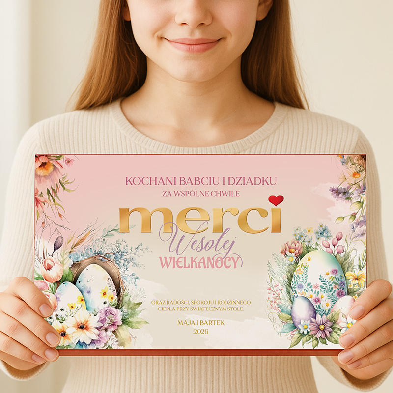 Bombonierka zawiera klasyczne czekoladki MERCI w ośmiu różnych smakach. Opakowanie utrzymane jest w delikatnej, pastelowej kolorystyce, która doskonale oddaje wiosenny klimat Wielkanocy. Centralnym elementem projektu jest złoty napis „merci”, symbolizujący wdzięczność, a pod nim napis “Wesołej Wielkanocy”. Wokół znajdują się kwiatowe kompozycje oraz dekoracyjne pisanki wielkanocne. Na froncie bombonierki znajduje się personalizowany tekst, na przykład: „Kochani Babciu i Dziadku”. Poniżej umieszczone są gotowe życzenia oraz podpis osób wręczających prezent wraz z datą.