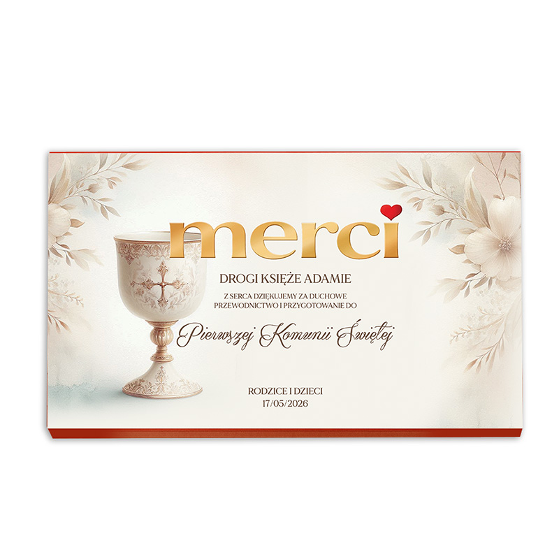 Opakowanie bombonierki utrzymane jest w eleganckiej, jasnej kolorystyce beżu i złota. Na grafice znajduje się stylowy kielich komunijny ozdobiony subtelnym ornamentem oraz duży napis „merci” z charakterystycznym czerwonym serduszkiem. Całość dopełniają delikatne motywy kwiatowe oraz elegancki tekst podziękowania za przygotowanie do Pierwszej Komunii Świętej. Personalizacji podlega imię księdza, podpis oraz data uroczystości.