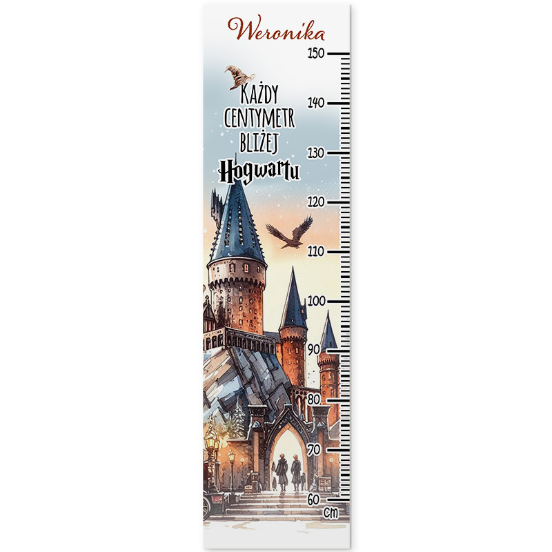Personalizowana miarka wzrostu z motywem Hogwartu to idealna dekoracja do pokoju dziecka, które kocha magię. Kolorowy nadruk i hasło „Każdy centymetr bliżej Hogwartu” motywują do wzrostu. Wspaniały prezent dla małego fana Harry’ego Pottera.
