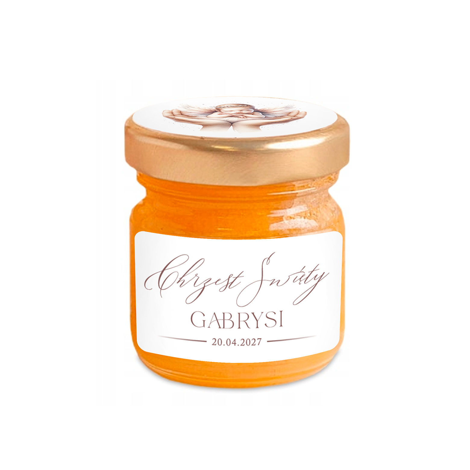 Miód w słoiczku to wyjątkowy, a zarazem praktyczny upominek, który z pewnością zostanie wykorzystany przez Twoich gości. W zestawie znajduje się aromatyczny miód w eleganckim słoiczku oraz etykiety do samodzielnego naklejenia, które są personalizowane imieniem dziecka i datą uroczystości. Na froncie słoiczka znajduje się elegancka etykieta z napisem „Chrzest Święty”, a poniżej imię dziecka oraz data chrztu, Zakrętka ozdobione jest grafiką przedstawiającą śpiącego aniołka, bezpiecznie ułożonego w dłoniach. Całość utrzymana jest w subtelnej, pastelowej tonacji, która doskonale wpasuje się w dekoracje stołu podczas chrztu. Dzięki temu miód staje się nie tylko słodkim upominkiem, ale i eleganckim dodatkiem do aranżacji uroczystości.