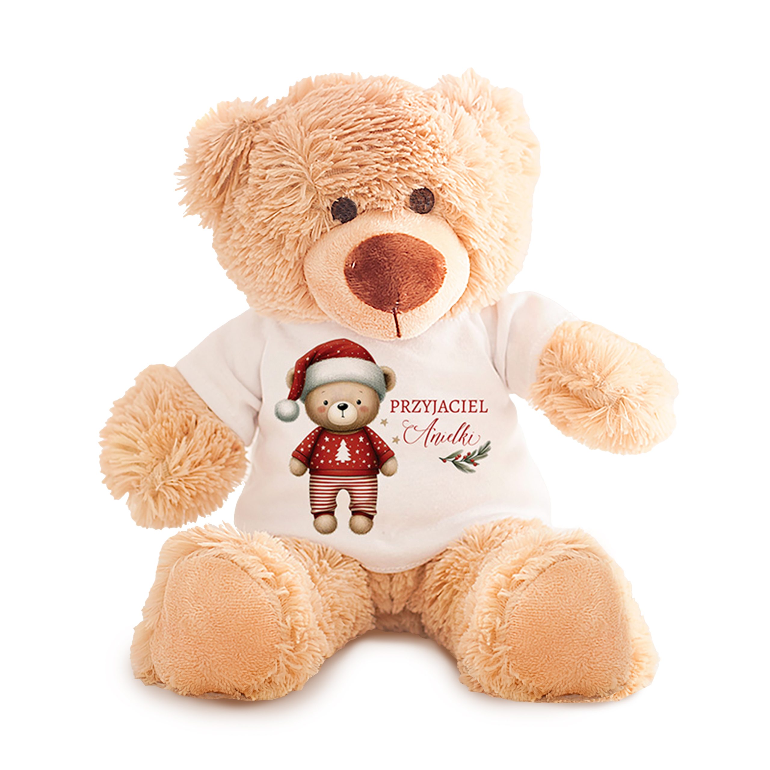 Miś Pluszowy Personalizowany to idealny wybór na prezent, który wywoła uśmiech na twarzy każdego dziecka. Dzięki miękkiemu i przyjemnemu w dotyku materiałowi, z którego został wykonany, jest nie tylko uroczą zabawką, ale także doskonałym towarzyszem codziennych przygód i przytulania. Jego beżowe futerko, starannie wykonany pyszczek oraz sympatyczny wygląd sprawiają, że szybko staje się ulubioną maskotką każdego malucha. Tym, co wyróżnia tego pluszowego misia, jest możliwość personalizacji. Na białej koszulce, którą nosi, można umieścić imię dziecka, co czyni go jedynym w swoim rodzaju upominkiem. Taki wyjątkowy akcent sprawia, że miś nabiera osobistego charakteru, co szczególnie podoba się zarówno dzieciom, jak i rodzicom. Dodatkowo koszulka zdobiona jest świątecznym wzorem – przedstawiającym uroczego misia w mikołajkowej czapce i świątecznym ubranku. Taki motyw wprowadza magiczny, zimowy klimat, idealny na okres Świąt Bożego Narodzenia.