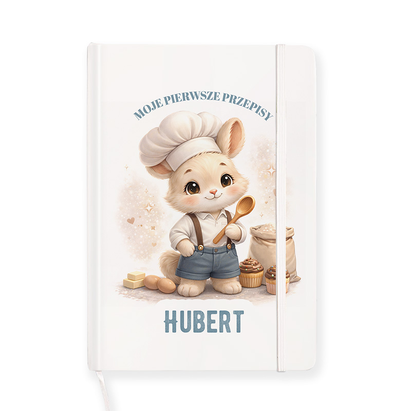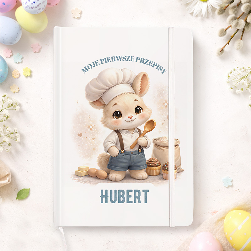 Okładkę notatnika zdobi sympatyczny zajączek trzymający kuchenne akcesoria oraz napis „Moje pierwsze przepisy”. Na dole umieszczone jest imię dziecka, które podlega personalizacji, dzięki czemu notatnik staje się wyjątkowy i przygotowany specjalnie dla młodego kucharza. Jasna, elegancka okładka sprawia, że notes prezentuje się estetycznie i doskonale pasuje do dziecięcej przestrzeni.