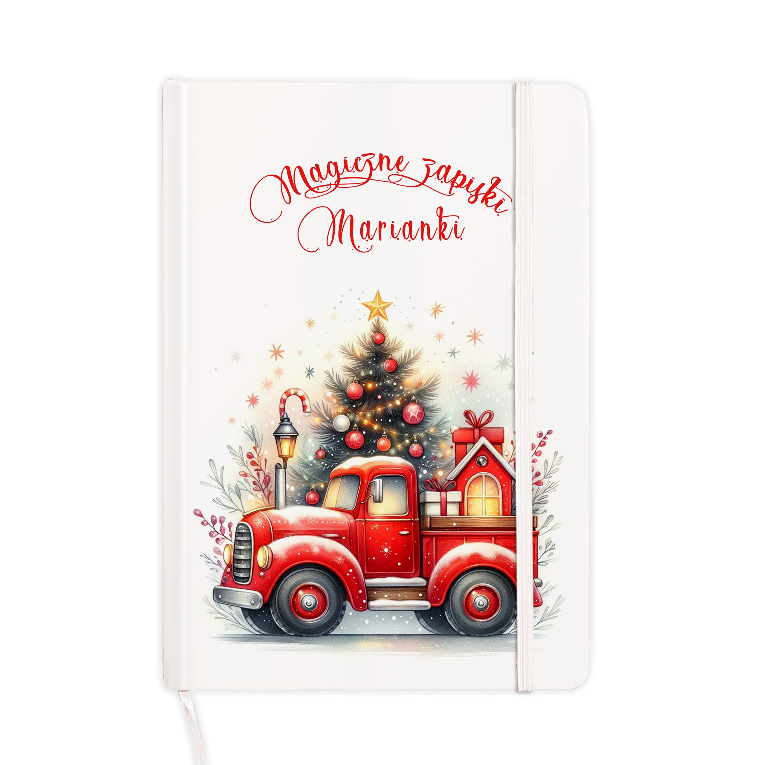 Wprowadź świąteczną magię do codzienności dzięki personalizowanemu notatnikowi z motywem bożonarodzeniowej ciężarówki! Urocza okładka przedstawia czerwony samochód w zimowej scenerii, z choinką i świątecznymi dekoracjami, wprowadzając w radosny klimat Świąt Bożego Narodzenia. Idealny jako prezent na Mikołajki lub pod choinkę – personalizowany notatnik to wyjątkowy upominek dla dzieci i dorosłych.