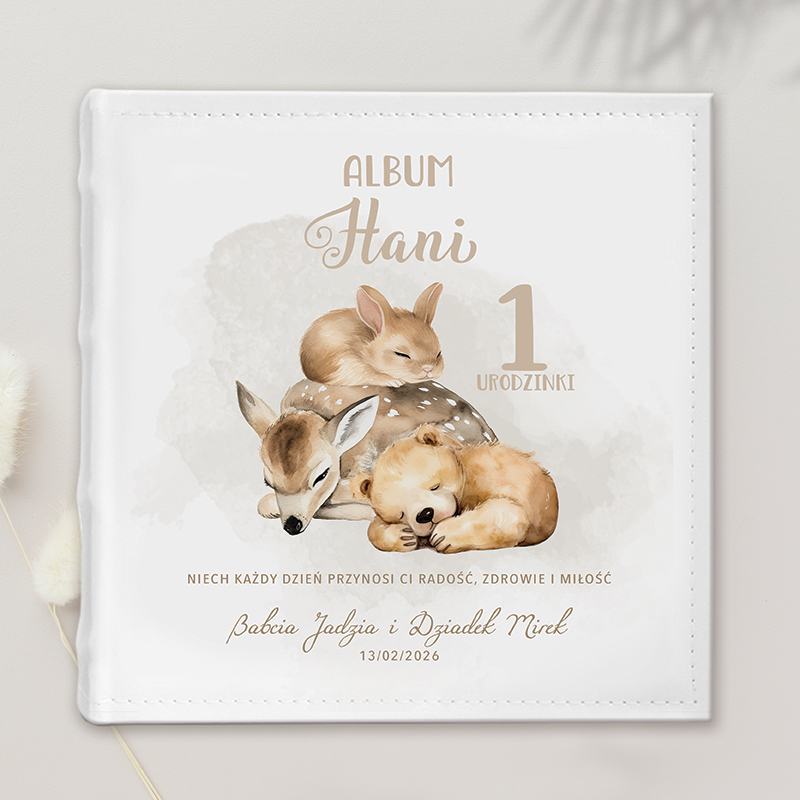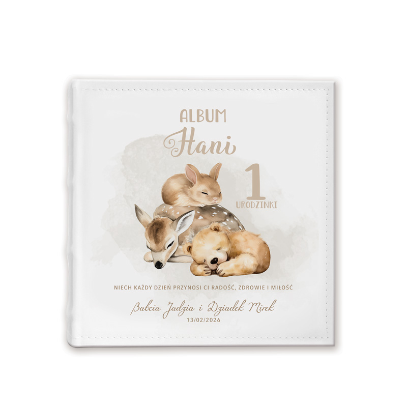 Okładkę zdobi urocza ilustracja śpiących leśnych zwierzątek w pastelowych barwach, która wprowadza ciepły, bajkowy klimat. Dzięki subtelnej kolorystyce album idealnie pasuje zarówno dla dziewczynki, jak i chłopca. Album mieści aż 200 zdjęć w formacie standardowym, umieszczanych w praktycznych kieszonkach. Dzięki wsuwanym stronom fotografie są bezpieczne i chronione przed zniszczeniem, a jednocześnie łatwo można je przeglądać i układać. Taka konstrukcja sprawia, że personalizowany album kieszeniowy jest wygodny w użytkowaniu. To doskonały pomysł na prezent na roczek, który wywoła uśmiech i wzruszenie u rodziców dziecka. Idealnie sprawdzi się także jako pamiątka od dziadków, chrzestnych czy bliskich przyjaciół rodziny.