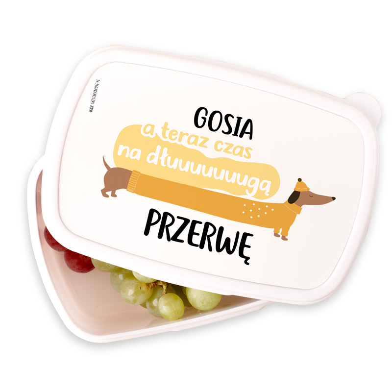 Pojemnik wykonany jest z lekkiego tworzywa, które dobrze sprawdza się w codziennym użytkowaniu. Bez problemu pomieści kanapki, owoce czy drobne przekąski, a jego konstrukcja chroni jedzenie przed zgnieceniem. Dzięki kompaktowym wymiarom śniadaniówka wygodnie mieści się w plecaku, torebce lub torbie podróżnej, co czyni ją praktycznym wyborem nie tylko na szkolne przerwy, ale także na pikniki czy wycieczki. Prosta forma ułatwia utrzymanie jej w czystości, dlatego korzystanie z niej jest wygodne każdego dnia. Wieczko zdobi grafika jamnika w żółtym sweterku oraz napis „A teraz czas na dłuuuuugą przerwę” uzupełniony o imię właściciela. Dzięki temu śniadaniówka jest personalizowana, co sprawia, że wyróżnia się wśród klasycznych pojemników i łatwo ją rozpoznać. Wesoły motyw z jamnikiem wywołuje uśmiech, a przy tym dodaje codziennym posiłkom odrobiny lekkości.