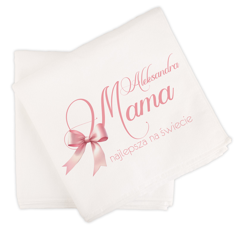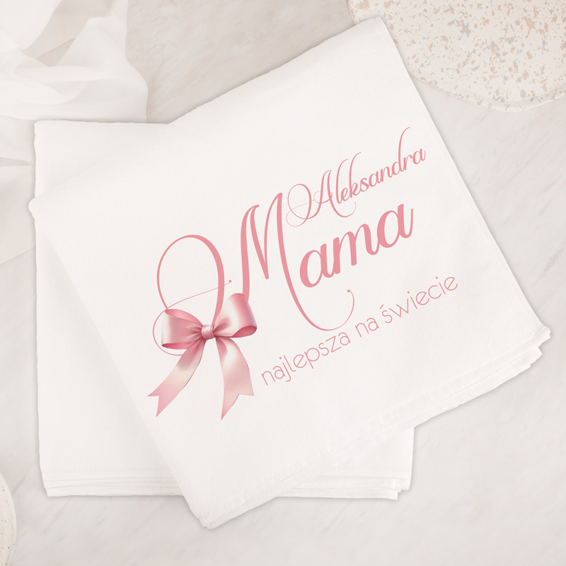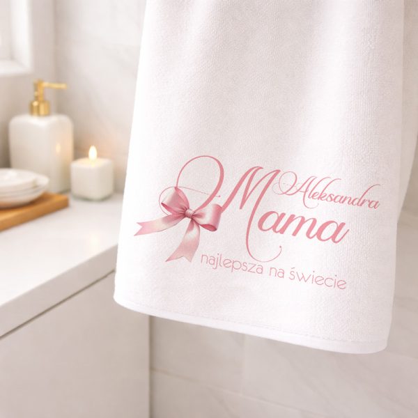 Na ręczniku znajduje się stylowy napis „Mama najlepsza na świecie” oraz dekoracyjna grafika z subtelną kokardką w delikatnym, różowym odcieniu. Całość utrzymana jest w jasnej, eleganckiej kolorystyce, która nadaje projektowi lekkości i kobiecego charakteru. Na ręczniku umieszczamy również imię mamy – jest to element podlegający personalizacji, dzięki któremu prezent staje się jeszcze bardziej wyjątkowy.