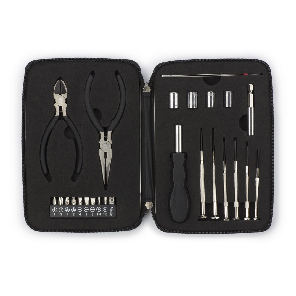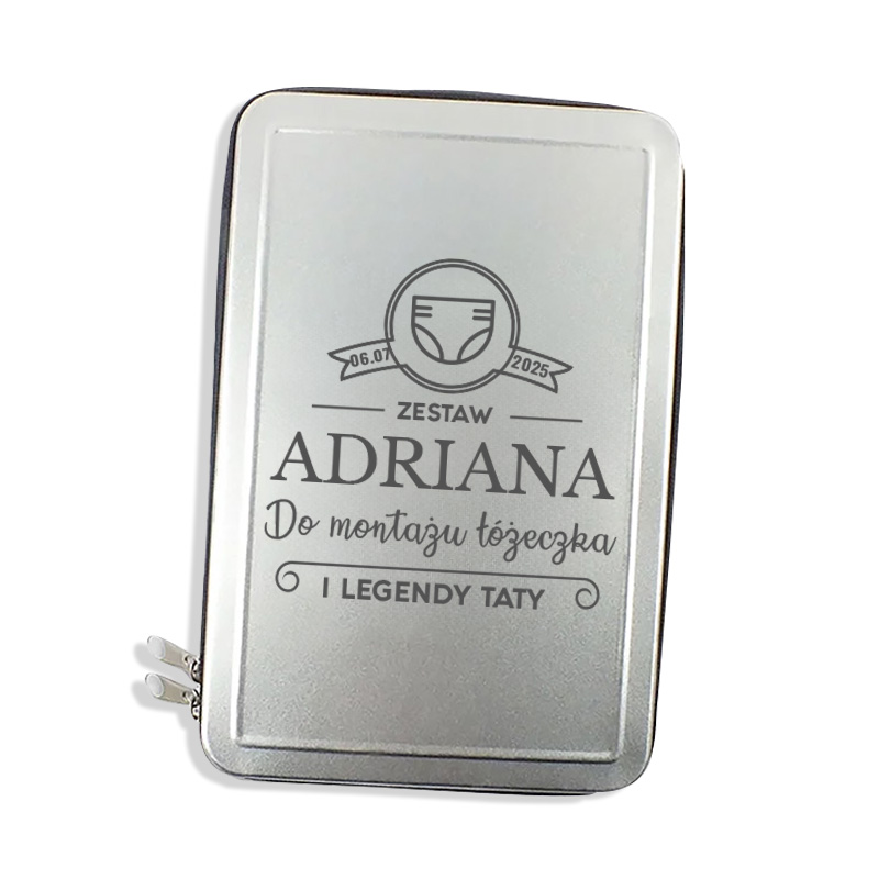 Zestaw zapakowany jest w solidne etui z personalizowanym grawerem na wieczku. Na pokrywie znajduje się data narodzin dziecka i imię taty oraz wyjątkowy napis, np. „Zestaw do montażu łóżeczka i legendy taty”. W środku znajduje się starannie dobrany komplet narzędzi, który przyda się podczas pierwszych domowych wyzwań. Całość została umieszczona w praktycznym etui z organizerem, dzięki czemu każde narzędzie ma swoje miejsce.