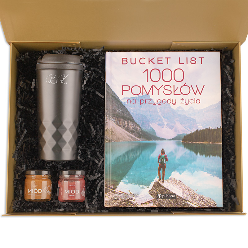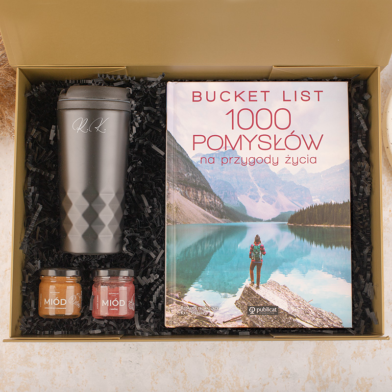 Zestaw prezentowy z kubkiem termicznym personalizowanym inicjałami, książką „Bucket List”, dwoma słoiczkami miodu i pudełkiem z imieniem w złotym kolorze to praktyczny prezent zarówno dla kobiety, jak i mężczyzny.