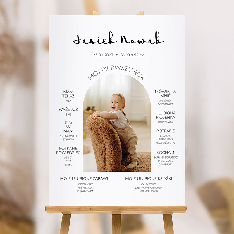 Plakat utrzymany jest w delikatnej, dziecięcej kolorystyce, która sprawia, że idealnie pasuje do pokoju malucha – zarówno tego urządzonego w jasnym, minimalistycznym stylu, jak i bardziej kolorowego i przytulnego wnętrza. Zdjęcie dziecka w centrum projektu w połączeniu z personalizacją nadaje mu indywidualnego charakteru, dzięki czemu plakat staje się wyjątkową ozdobą, którą później można przechowywać jako pamiątkę uwieczniającą, jakie było i co najbardziej lubiło dziecko w swoim pierwszym roku życia. Co więcej, taki plakat świetnie sprawdzi się także jako dekoracja podczas przyjęcia pierwszych urodzin – umieszczony w sali będzie efektownym akcentem, który zwróci uwagę gości.