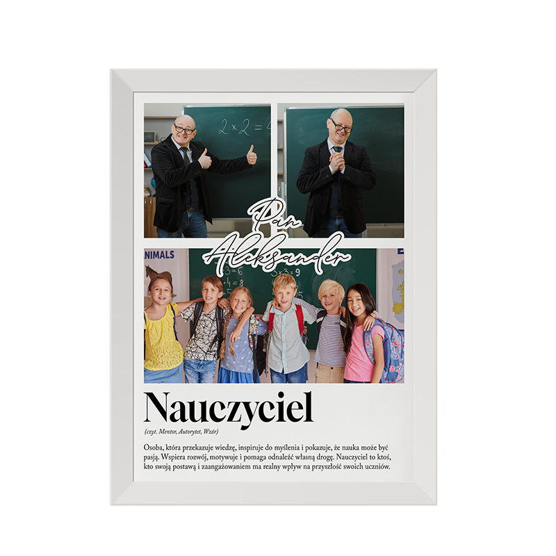 Projekt plakatu utrzymany jest w eleganckiej, jasnej stylistyce, z miejscem na trzy zdjęcia tworzące spójną i osobistą kompozycję. W centralnej części znajduje się imię podlegające personalizacji, a poniżej wyraźny napis „Nauczyciel” lub „Nauczycielka” – w zależności od wybranego wariantu. Całość uzupełnia starannie dobrana definicja, która w piękny sposób oddaje znaczenie tej wyjątkowej roli, tworząc wzruszający i estetyczny projekt.