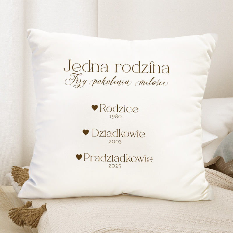 Poduszka wykonana jest z miękkiego, przyjemnego w dotyku materiału w jasnym kolorze. Na froncie poduszki znajduje się napis: „Jedna rodzina – Trzy pokolenia miłości”, zapisane elegancką, ozdobną czcionką. Poniżej umieszczono trzy pokolenia z przypisanymi datami: „Rodzice – [rok]”, „Dziadkowie – [rok]” i „Pradziadkowie – [rok]”. Całość prezentuje się niezwykle harmonijnie i wzruszająco.