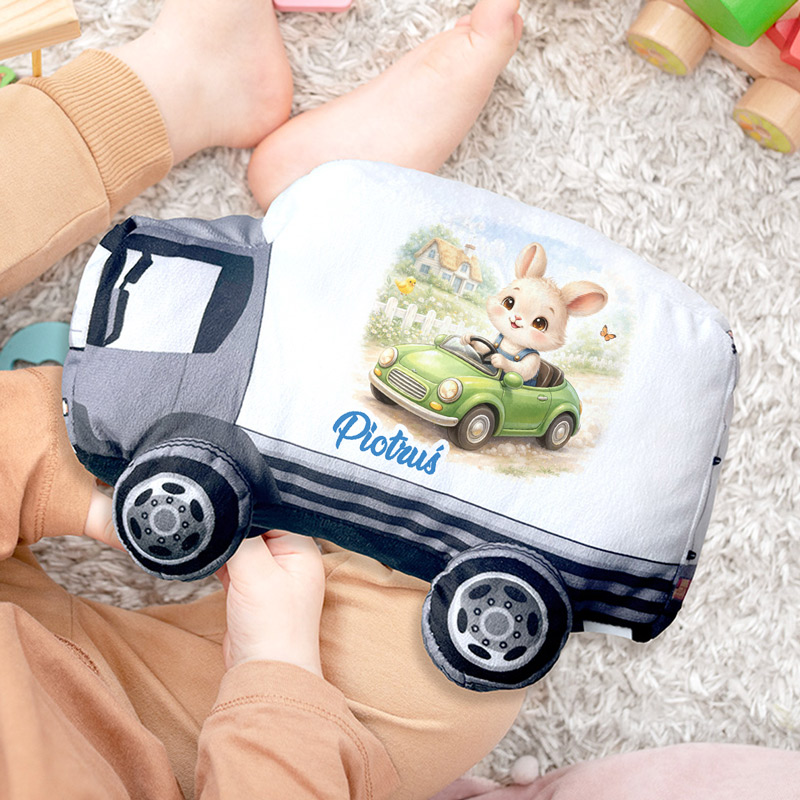 Poduszka w kształcie ciężarówki to wyjątkowy i oryginalny prezent wielkanocny dla chłopca, który zachwyca ciekawym kształtem i bajkową grafiką. Na poduszce znajduje się ilustracja uroczego zajączka jadącego samochodem oraz imię dziecka podlegające personalizacji, dzięki czemu staje się ona wyjątkową pamiątką. Miękka i przyjemna w dotyku poduszka świetnie sprawdzi się jako dekoracja dziecięcego pokoju, przytulanka lub towarzysz codziennych zabaw.