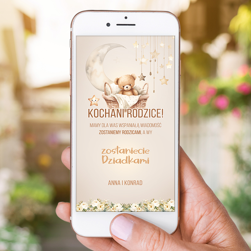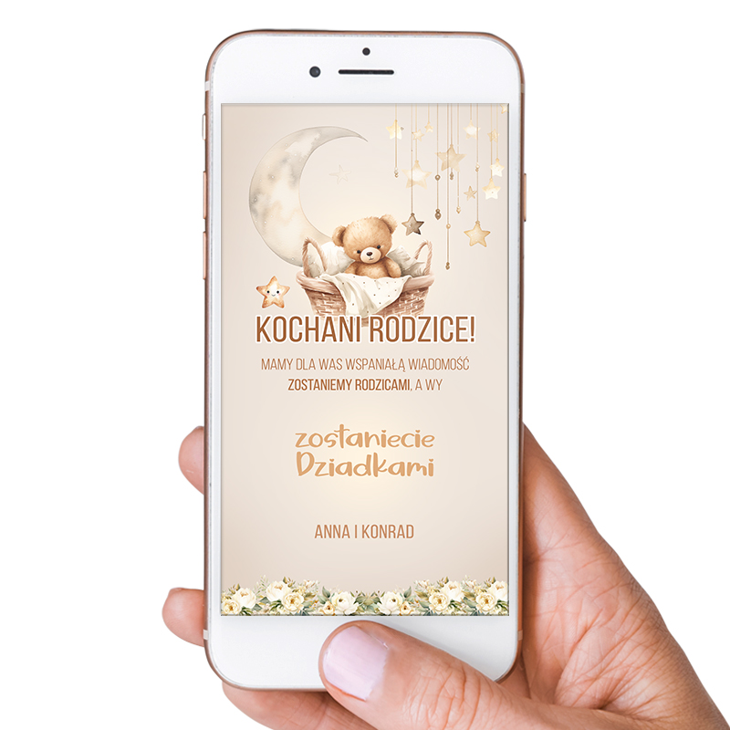 Powiadomienie elektroniczne rodziców o ciąży to uroczy i pełen ciepła sposób na ogłoszenie najpiękniejszej wiadomości – że wkrótce zostaną oni dziadkami. Delikatna grafika z misiem w koszyczku pod księżycem oraz pastelowe elementy dekoracyjne nadają projektowi subtelności i uroku. Elegancka czcionka w połączeniu z personalizacją imion przyszłych rodziców nadaje powiadomieniu osobistego charakteru.