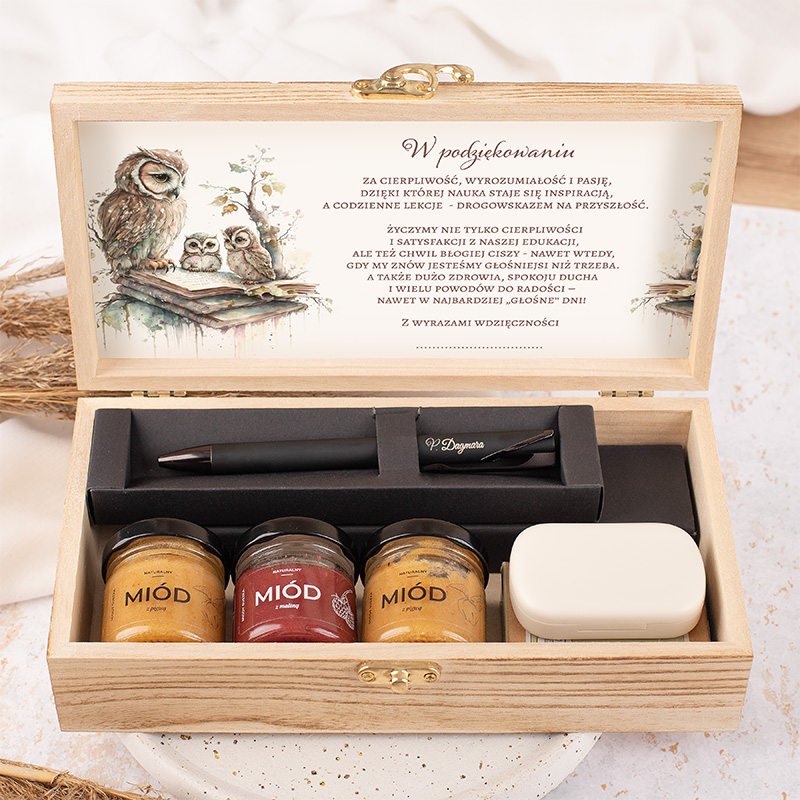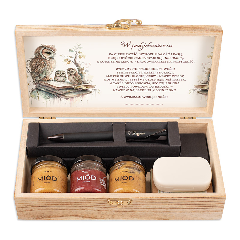Drewniane pudełko z grafiką sów kryje trzy słoiczki polskiego miodu, elegancki długopis w etui oraz praktyczne zatyczki do uszu. To piękny upominek od uczniów, który w symboliczny i praktyczny sposób wyraża wdzięczność nauczycielowi.