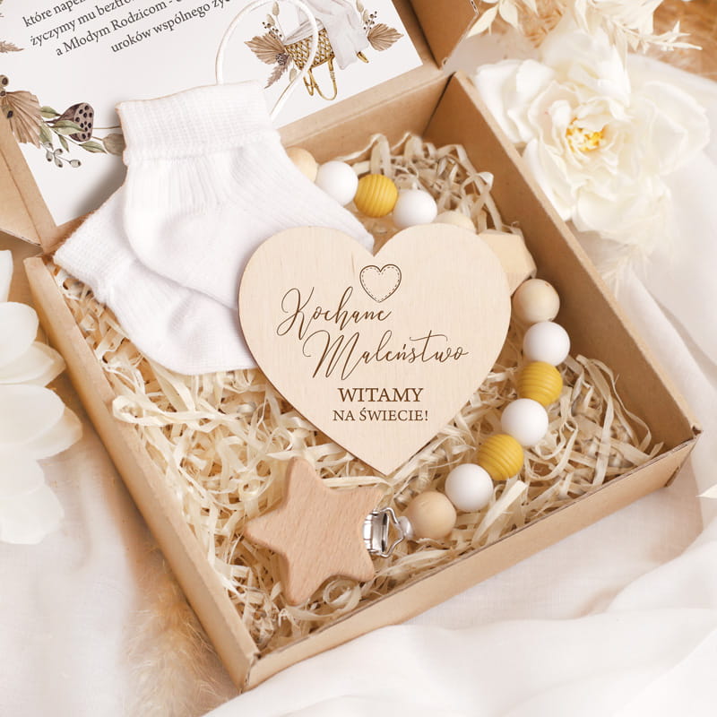 Box upominków na narodziny dziecka. Prezent z okazji narodzin dziecka w postaci upominków w kraftowym pudełku. Wewnątrz opakowania umieścimy niemowlęce skarpetki, zawieszkę do smoczka i tabliczkę w kształcie serca. Oczywiście nie zabraknie również życzeń z okazji narodzin maluszka.