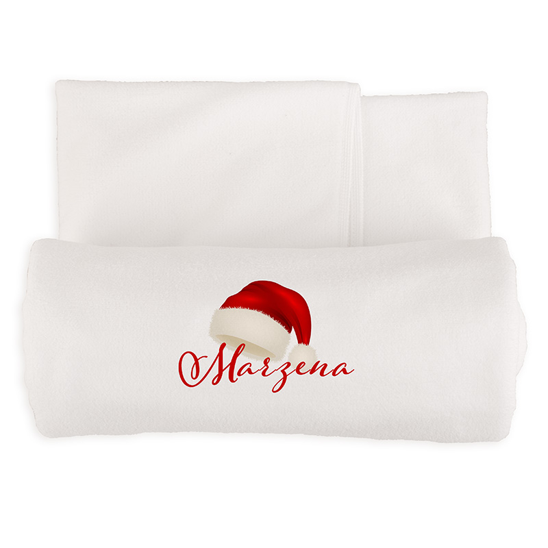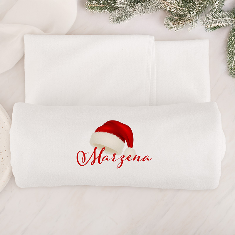 Ręcznik został wykonany z miękkiego materiału, który jest delikatny dla skóry dziecka. Idealnie sprawdza się po kąpieli, na basenie lub podczas świątecznych wyjazdów. Produkt jest lekki, dobrze się składa i nie zajmuje dużo miejsca w torbie czy plecaku. Biała tkanina nadaje mu klasyczny wygląd. Na ręczniku znajduje się personalizowany napis – imię dziecka zapisane ozdobną czcionką w czerwonym kolorze. Nad nim widnieje urocza czapka świętego Mikołaja.