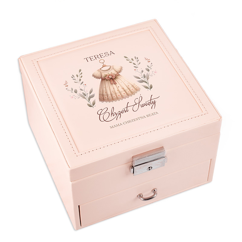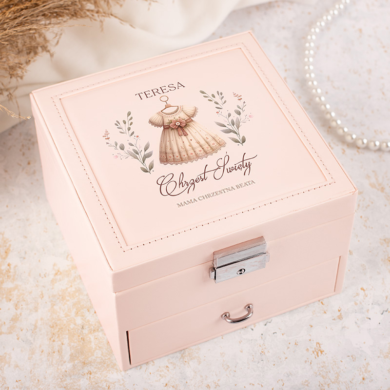 Elegancka szkatułka w delikatnym pudrowym kolorze, ozdobiona delikatną grafiką dziecięcej sukienki, stanowi doskonałą pamiątkę Chrztu Świętego dla dziewczynki. Personalizacja imieniem i podpisem nadaje szkatułce osobistego charakteru i sprawia, że prezent zyskuje głębokie znaczenie. Taki praktyczny prezent na chrzest dla dziewczynki to nie tylko modny gadżet, ale symbol rodzinnego ciepła i miłości. We wnętrzu szkatułki znalazły się praktyczne przegródki, które ułatwiają organizację biżuterii i drobnych pamiątek – jak medalik, różaniec. Dodatkowa szufladka zwiększa pojemność i pozwala na wygodne przechowywanie biżuterii i dziecięcych drobiazgów. Obecność lusterka dodaje funkcjonalności, a zamek z kluczykiem gwarantuje bezpieczeństwo przechowywanych przedmiotów.