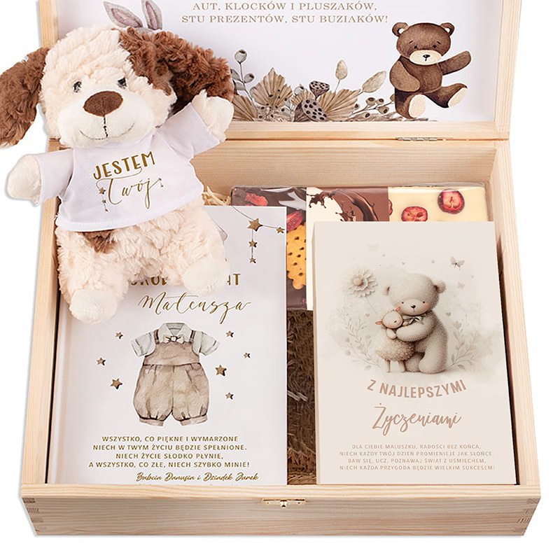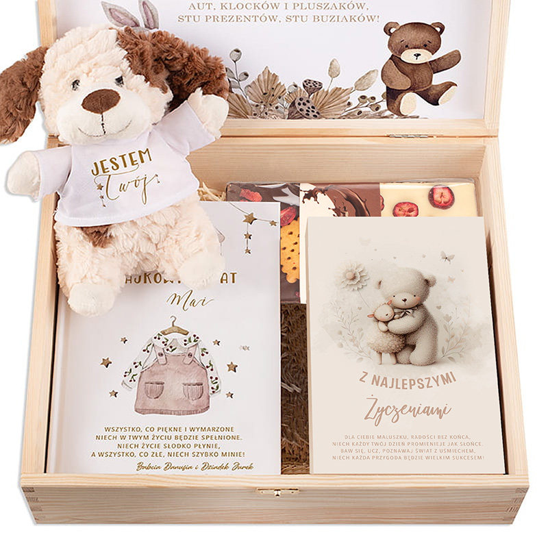 W skład zestawu wchodzi personalizowana książka z bajkami, której okładka jest pełna kolorowych ilustracji, a opowiadania stworzone przez polskie autorki przyciągają uwagę i rozwijają wyobraźnię dzieci. Sztućce z imieniem dziecka, umieszczone w ozdobnym pudełku. Na sztućcach znajdziesz imię dziecka oraz motyw zwierzątek, co sprawia, że posiłki staną się jeszcze bardziej osobiste. Czekolada dodatkami to słodki akcent w zestawie. Pluszak w postaci uroczego pieska z koszulką, na której widnieje napis “Jestem Twój”, będzie towarzyszem i przyjacielem dziecka. Ozdobny grawer na wieczku skrzyni przedstawiający chłopca lub dziewczynkę idącego pośrodku dwóch dorosłych postaci, trzymających go za ręce, jest wyjątkowym dodatkiem. Dedykacja “Samych odważnych kroków” nadaje temu prezentowi osobistego charakteru. Wewnątrz skrzyni znajdziesz również ozdobną wklejkę z grafiką w stylu boho, na której umieścimy życzenia urodzinowe, aby uprzyjemnić dziecku ten wyjątkowy dzień.