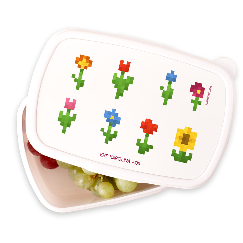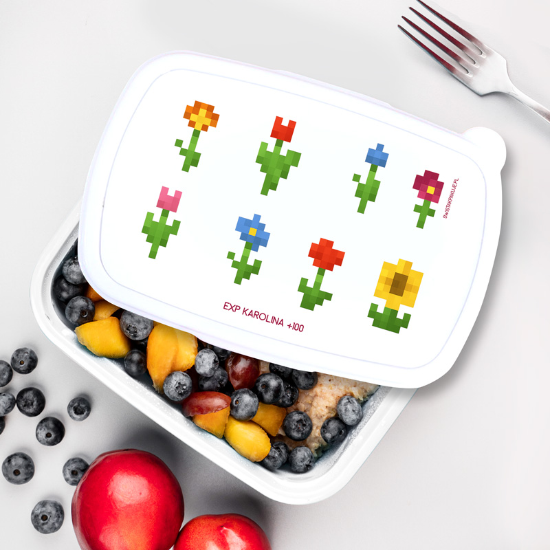 Biała śniadaniówka z nadrukiem pikselowych kwiatów i personalizacją to praktyczny i oryginalny gadżet dla małej fanki Minecrafta.