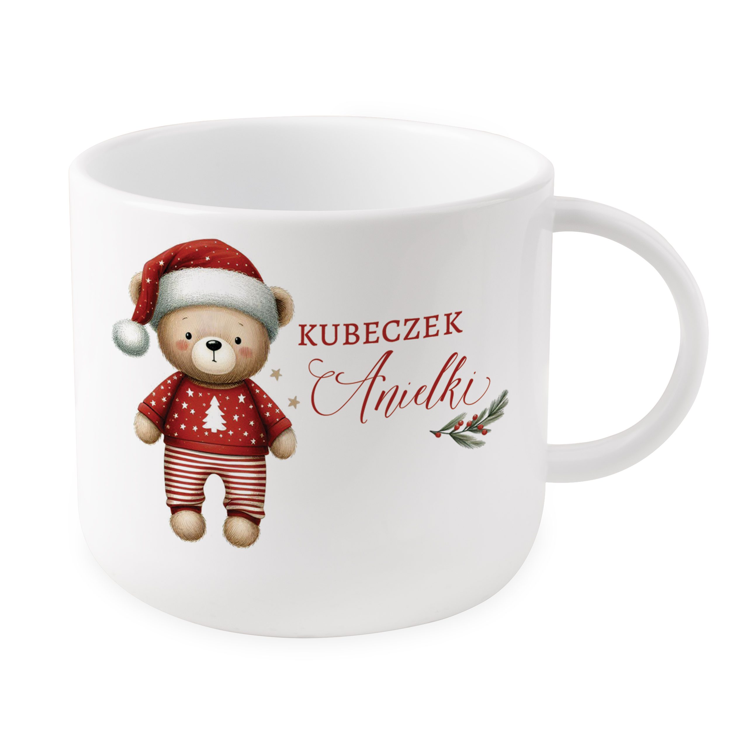 Plastik użyty do produkcji kubka cechuje się wysoką odpornością na uszkodzenia mechaniczne. Dzięki temu kubek ten świetnie sprawdzi się zarówno podczas rodzinnych śniadań, jak i w przydomowych ogrodach, gdzie dzieci mogą bawić się bez obaw, że kubek się zniszczy. Dodatkowo elegancki świąteczny motyw, w połączeniu z imiennym nadrukiem, sprawia, że jest to doskonały pomysł na prezent. Na kubku znajduje się uroczy miś, który wprost emanuje świątecznym klimatem. Jest to pluszowy miś ubrany w ciepłe, czerwone świąteczne ubranko. Ma na głowie charakterystyczną czapkę Mikołaja, która doskonale pasuje do bożonarodzeniowego nastroju.