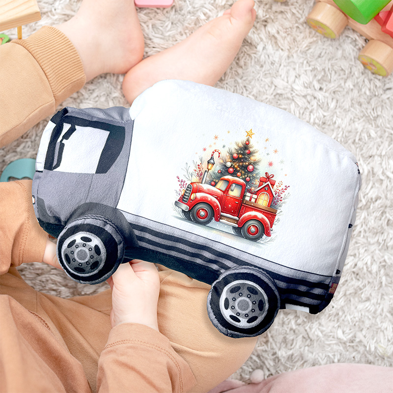 Świąteczny zestaw prezentowy dla dziecka z bidonem, czekoladą, poduszką w kształcie ciężarówki i personalizowaną książką. Zapakowany w ozdobne pudełko – gotowy do wręczenia.