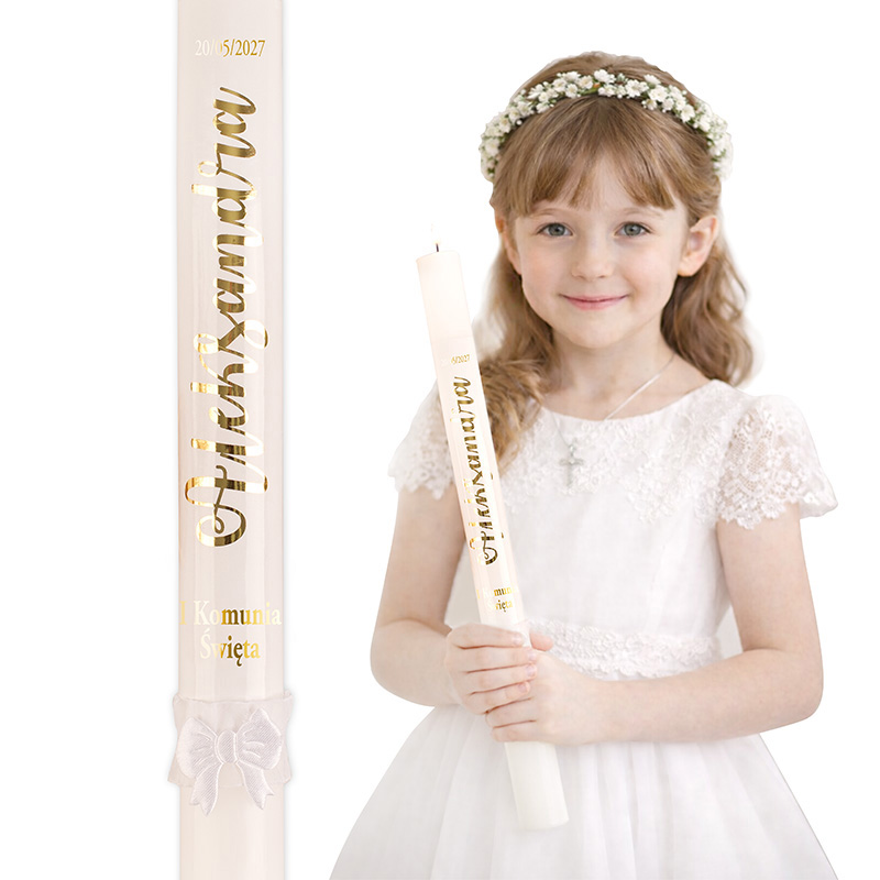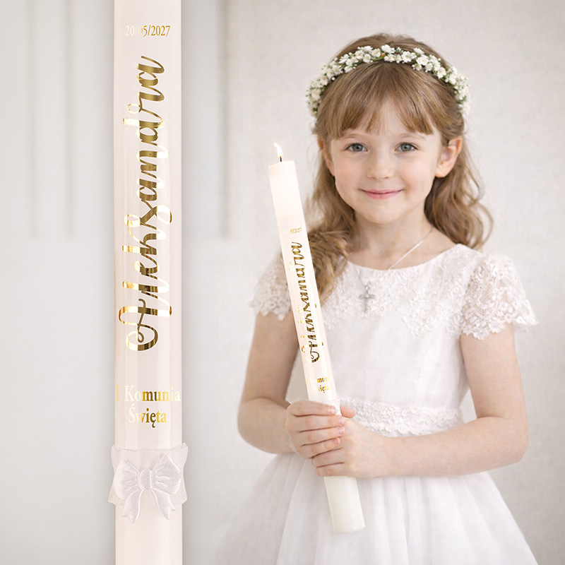 Na świecy znajduje się imię dziecka oraz data uroczystości, które podlegają personalizacji, dzięki czemu każda świeca jest przygotowywana indywidualnie dla konkretnego dziecka. Złoty, elegancki nadruk pięknie prezentuje się na tle klasycznej bieli, a dekoracyjna kokardka dodaje całości delikatności i komunijnego charakteru. Starannie wykonane detale sprawiają, że świeca doskonale wpisuje się w estetykę uroczystości komunijnej.