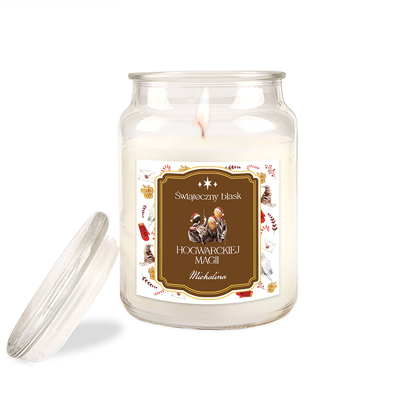 Świeca w eleganckim słoiku z pokrywką pali się długo i pięknie pachnie. Świecę zdobi personalizowana etykieta, na której znajduje się grafika przedstawiająca trzech czarodziejów w czapkach świątecznych, co w subtelny sposób łączy klimat Bożego Narodzenia z atmosferą Hogwartu. Napis „Świąteczny blask Hogwarckiej Magii” oraz personalizacja imieniem obdarowanego czynią ją idealnym prezentem świątecznym.