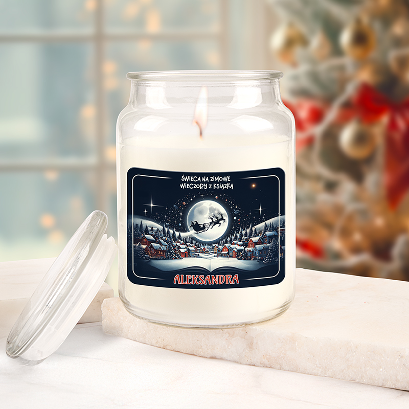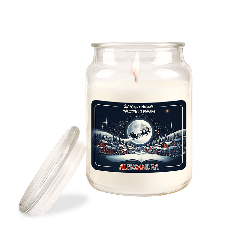 Świeca zamknięta jest w eleganckim słoju z wieczkiem. To idealny dodatek do wieczornego czytania lub odpoczynku przy gorącej herbacie. Etykieta świecy zachwyca detalami na ciemnym tle rozciąga się bajkowa ilustracja zimowej wioski, nad którą świeci ogromny księżyc, a na jego tle przelatuje Mikołaj w saniach ciągniętych przez renifery. Nad grafiką znajduje się napis „Świeca na zimowe wieczory z książką”, a na dole – personalizowane imię obdarowywanej osoby, dzięki czemu prezent staje się wyjątkowy i osobisty.