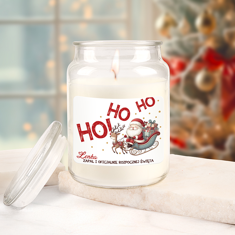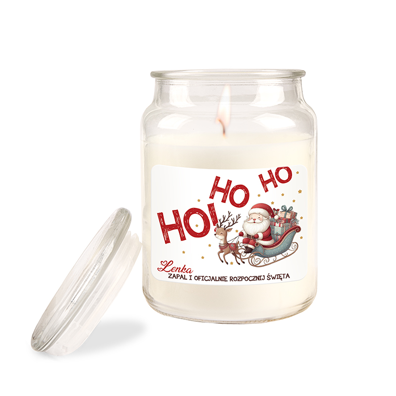 Świeca znajduje się w eleganckim, szklanym słoju z wieczkiem, co sprawia, że prezentuje się estetycznie i pasuje do każdej aranżacji wnętrza. Na froncie znajduje się kolorowa grafika przedstawiająca Świętego Mikołaja w saniach ciągniętych przez renifera. Obok widnieje napis “HO HO HO!”, a pod grafiką umieszczony jest personalizowany podpis z imieniem obdarowanej osoby oraz napis „Zapal i oficjalnie rozpocznij święta”.