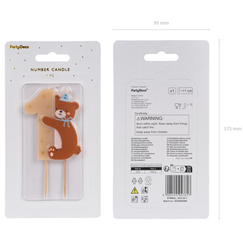 Świeczka ma kształt cyferki 1 ozdobionej subtelnymi, złotymi gwiazdkami. Do cyferki po jej jednej stronie przytula się brązowy miś z niebieską kokardką i czapeczką imprezową. Całość prezentuje się niezwykle uroczo. Świeczka w kształcie cyferki 1 z misiem posiada dwa drewniane patyczki, dzięki czemu jest łatwa w montażu na torcie.