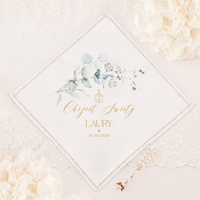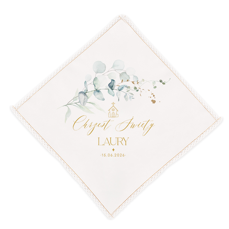 Szatka chrzcielna z motywem liści eukaliptusa to stylowy dodatek na ceremonię chrztu. Jej brzegi, delikatnie zdobione złotem, są obszyte koronką. Na froncie umieszczono personalizowany napis z imieniem dziecka i datą uroczystości. Centralną część zdobi subtelna grafika kościółka, otoczona gałązkami eukaliptusa. Ten roślinny wzór nadaje szatce świeżości i elegancji. Uniwersalny design sprawia, że szatka nadaje się zarówno dla dziewczynki, jak i chłopca. Tradycyjny, kwadratowy kształt ułatwia przykrycie maluszka.