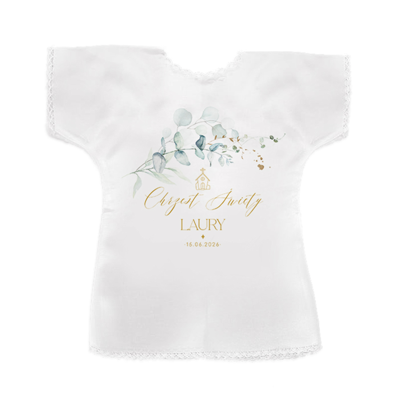 Szatka chrzcielna z personalizacją i roślinną grafiką ma formę ubranka i wykonana jest z miękkiego białego materiału o satynowym wykończeniu. Na jej froncie znajduje się delikatna grafika przedstawiająca gałązki eukaliptusa i wizerunek kościoła, a także napis: