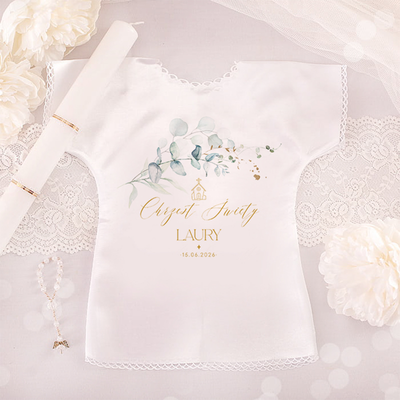 Biała, personalizowana szatka z eleganckim motywem eukaliptusa to idealny wybór dla miłośników nowoczesnego i stylowego designu. Biel, symbolizująca czystość i niewinność, w połączeniu z eukaliptusem, kojarzonym z oczyszczeniem i energią, doskonale odzwierciedla symbolikę chrztu. Ta satynowa szatka z imieniem dziecka stanowi nie tylko symboliczny element ceremonii, ale także piękną pamiątkę na lata.