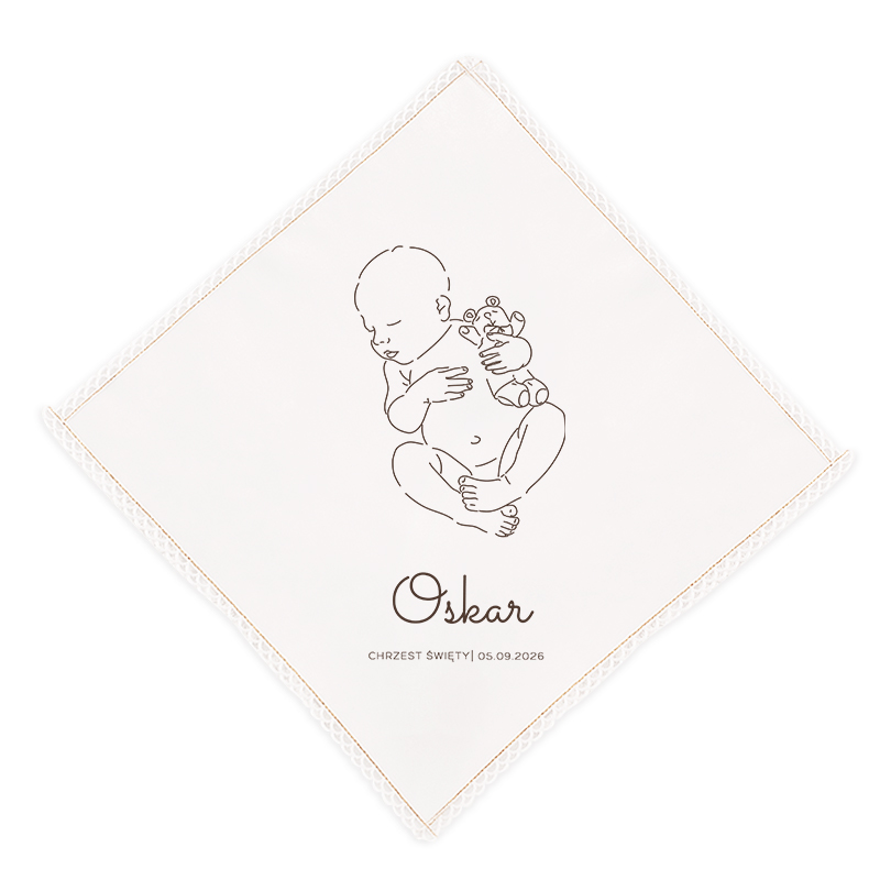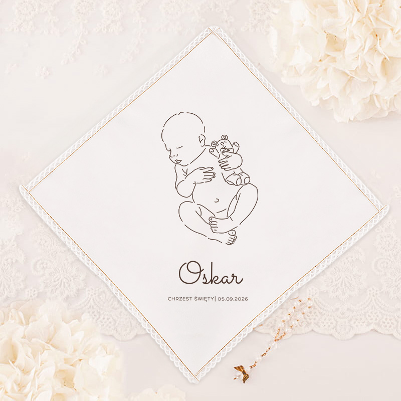 Szatka na Chrzest dla chłopca wykonana jest z wysokiej jakości materiału, który zapewnia delikatność i miękkość w dotyku. Jej design dodaje elegancji i wyróżnia się spośród tradycyjnych szatek. Brzegi szatki są subtelnie złocone, co dodaje jej wyjątkowego blasku i podkreśla uroczysty charakter ceremonii. Centralnym punktem szatki jest piękna grafika przedstawiająca kontur noworodka. Minimalistyczny rysunek emanuje delikatnością i ciepłem, idealnie wpisując się w sakralny charakter wydarzenia. Pod grafiką znajduje się imię dziecka oraz data Chrztu Świętego, co nadaje szatce osobisty i niepowtarzalny charakter.