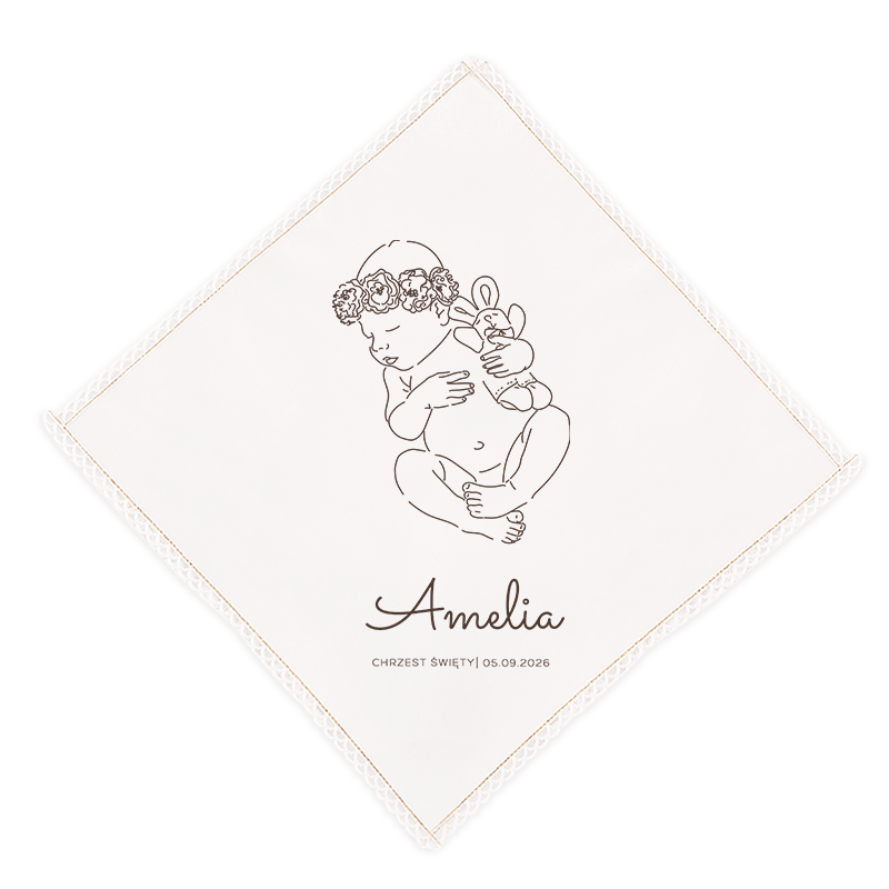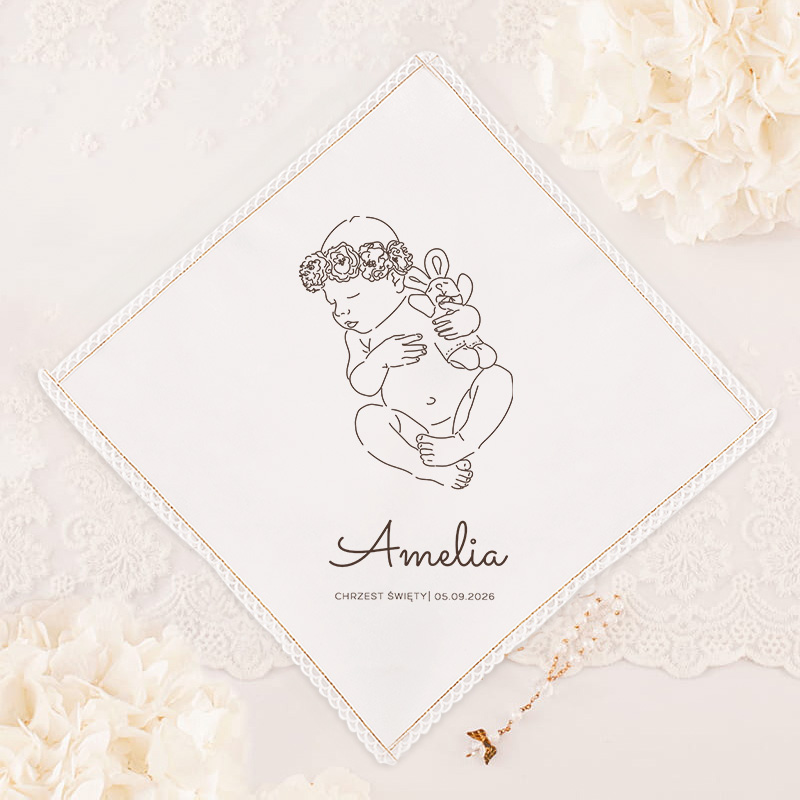 Szatka do Chrztu Świętego dla dziewczynki zachwyca swoim subtelnym i uroczym wyglądem. W centralnym punkcie szatki znajduje się delikatny kontur śpiącej dziewczynki z wiankiem na głowie, co nadaje jej niezwykłego wdzięku. Rysunek jest subtelny, a jednocześnie pełen emocji, co sprawia, że idealnie oddaje atmosferę tego dnia. Dodatkowo, na szatce umieszczono imię dziecka oraz datę uroczystości, co czyni ją w pełni personalizowaną i unikatową. Złocony brzeg szatki dodaje elegancji i prestiżu. Całość dopełnia delikatna koronka, która otacza brzegi, nadając lekkości i subtelności.