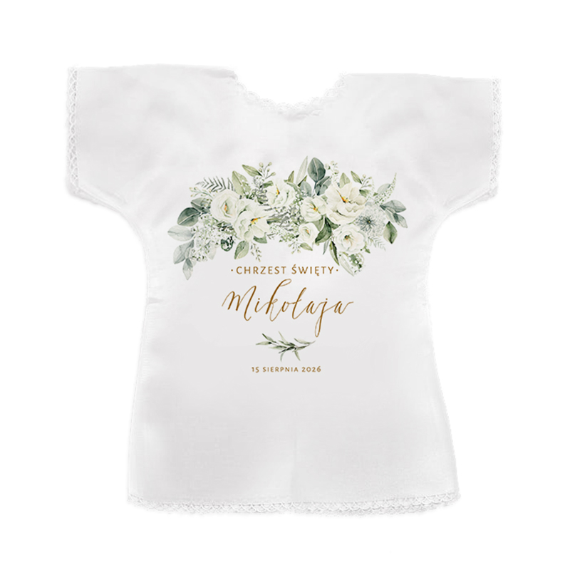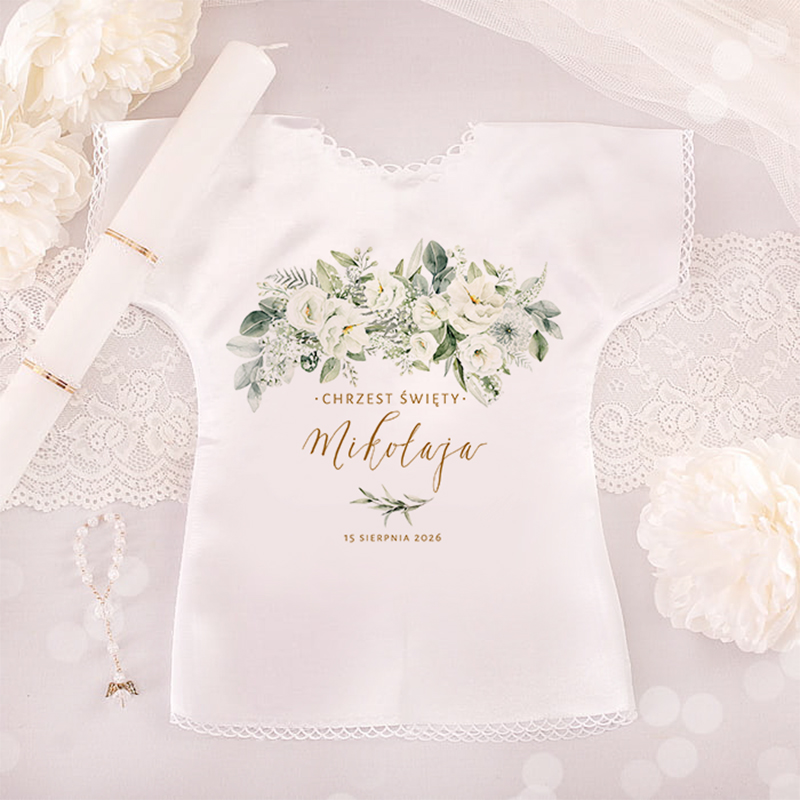 Nasza szatka chrzcielna została wykonana z materiałów wysokiej jakości, co gwarantuje jej trwałość i odporność na plamy, a także zachowanie pięknego wyglądu na długie lata. Personalizacja szatki, zawierająca napis Chrzest Święty, imię dziecka oraz datę ceremonii, nadaje jej unikalny charakter i czyni ją wyjątkowym darem dla Waszego malucha. Do szatki zastosowano dwie rodzaje czcionek: jedna nawiązująca do tradycji pięknego kaligraficznego pisma, a druga o klasycznej i eleganckiej estetyce, co tworzy kontrast pełen klasy i stylu. Dodatkowo, ilustracje kwiatów i liści, wykonane z artystyczną precyzją, dodają szatce wyrafinowania. Pastelowe odcienie zieleni i bieli tworzą harmonijny kontrast na tle białej tkaniny, a całość sprawia, że szatka prezentuje się niezwykle dostojnie.