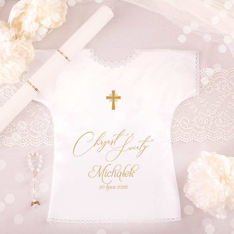 Biała tkanina szatki chrzcielnej nie tylko symbolizuje czystość i niewinność, ale również stanowi doskonałe tło dla wyhaftowanego symbolicznego krzyża. Delikatne ażurowe wzory, które zdobią koszulkę, nadają jej wyjątkowej elegancji, zaś dzięki zastosowaniu nowoczesnych technik nadruku, napis Chrzest Święty, imię dziecka oraz data uroczystości zostaną trwale i estetycznie uwiecznione na ubranku.