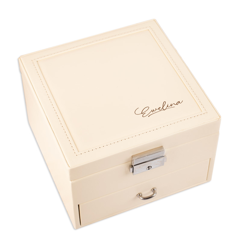 Skórzana szkatułka posiada elegancki, kremowy kolor. Jej klasyczna forma i subtelne przeszycia na wieczku nadają całości ponadczasowy charakter. Na górze umieszczone jest imię obdarowanej osoby. Delikatny, minimalistyczny napis pięknie komponuje się z jasną kolorystyką kuferka. Szkatułka wyposażona jest w praktyczne zamknięcie na kluczyk. Wnętrze szkatułki zostało zaprojektowane z myślą o wygodnej organizacji – znajdują się tu specjalne przegródki do przechowywania biżuterii i akcesoriów. Dodatkowa szufladka z 9 przegrodami pozwala uporządkować drobne elementy, a miękka wyściółka chroni biżuterię przed zarysowaniami. W środku znajduje się także praktyczne lusterko, które ułatwia szybkie założenie ulubionych dodatków.