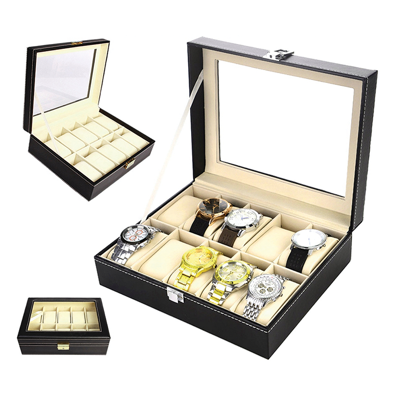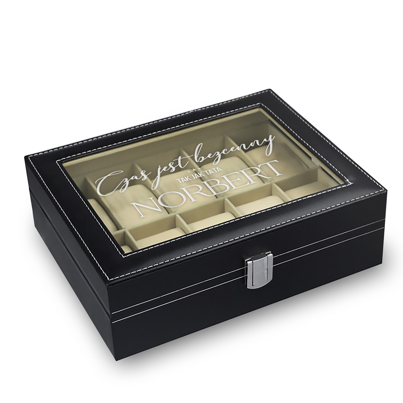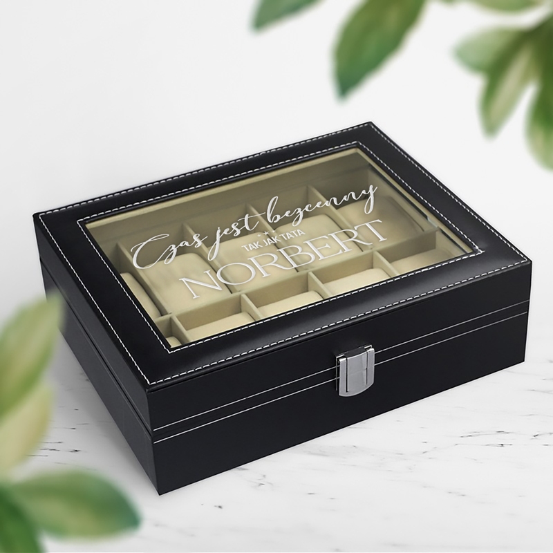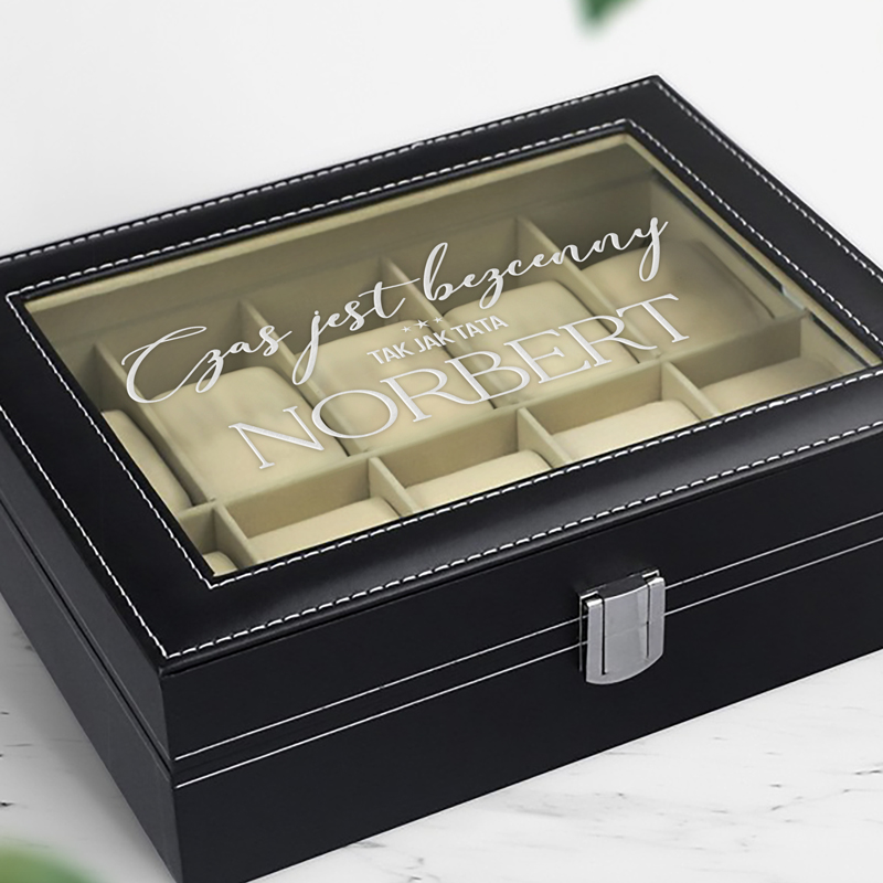 Personalizowana szkatułka na zegarki to elegancki i funkcjonalny prezent dla taty, który lubi porządek w swojej kolekcji zegarków, a jednocześnie docenia stylowe upominki. To etui w ponadczasowej czerni z kontrastowymi, białymi przeszyciami prezentuje się nowocześnie i będzie pasować zarówno do gabinetu, jak i do sypialni czy salonu. Szklane wieko chroni zegarki przed kurzem, a jednocześnie umożliwia podziwianie kolekcji bez otwierania szkatułki. Wnętrze zostało zaprojektowane z myślą o kolekcjonerach – mieści 10 przegródek z jasnymi, miękkimi poduszkami, które zapobiegają rysowaniu się zegarków i ułatwiają ich estetyczną ekspozycję. Całość zamykana jest na metalowy zatrzask, który zapewnia bezpieczne przechowywanie.