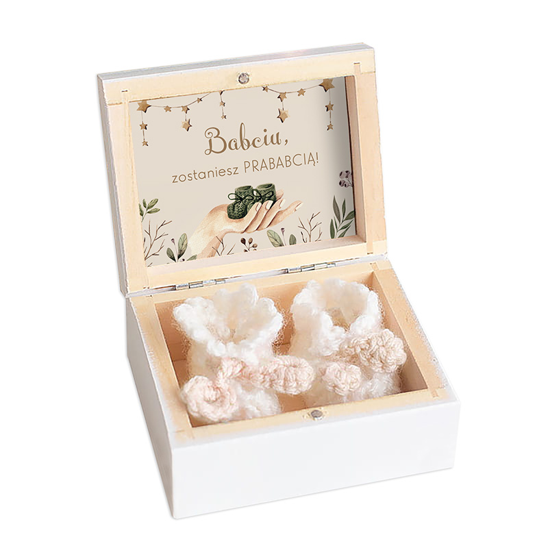 Szkatułka została wykonana z naturalnego drewna. Wewnątrz znajdują się miękkie, ręcznie wykonane buciki niemowlęce w jasnych, neutralnych kolorach. Dodatkowo w środku szkatułki umieszczona jest ozdobna wklejka z grafiką dłoni trzymającej buciki oraz napis do wyboru: „Dziadku, zostaniesz pradziadkiem!”, „Babciu, zostaniesz prababcią!” lub „Dziadkowie, zostaniecie pradziadkami!”. Dzięki temu bez trudu dopasujesz wariant do osoby lub pary, której chcesz przekazać radosną wiadomość.