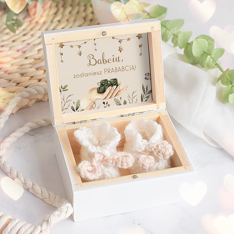 Szkatułka z bucikami to piękny sposób poinformowania pradziadków o ciąży, który pozwala przekazać radosną nowinę w subtelny i elegancki sposób.