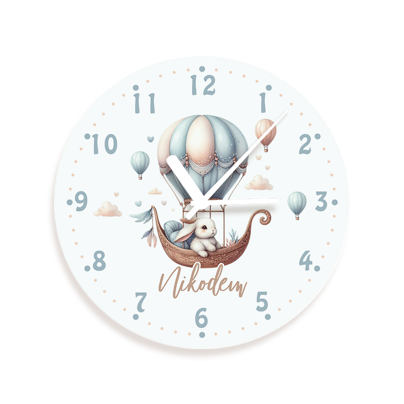 Szklany zegar dziecięcy – Dziecięce Marzenia to praktyczna dekoracja do pokoju dziecka, która łączy funkcjonalność z bajkowym designem. Tarcza zegara utrzymana jest w jasnej kolorystyce, a duże cyfry godzinowe sprawiają, że odczytanie czasu jest proste i czytelne nawet dla najmłodszych. Na środku znajduje się ilustracja uroczego króliczka siedzącego w koszu balonu unoszącego się wśród pastelowych chmurek i baloników. Całość została zaprojektowana w delikatnych odcieniach błękitu, beżu i różu, dzięki czemu zegar wpisuje się zarówno w aranżacje w stylu boho, jak i w klasyczny wystrój dziecięcego pokoju. Personalizacja obejmuje nadruk imienia dziecka umieszczony na tarczy, co sprawia, że zegar staje się elementem wystroju dopasowanym do małego właściciela.
