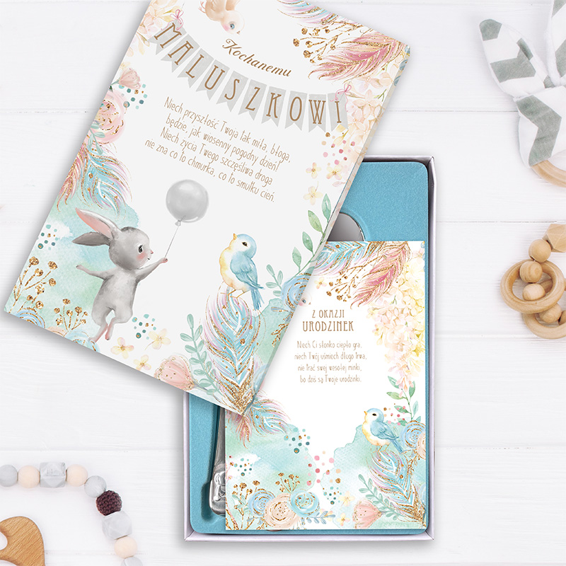 Personalizowany zestaw sztućców w eleganckim pudełku z ilustracją króliczka i kartą z życzeniami to wyjątkowy prezent urodzinowy dla dziecka. Uroczy komplet łączy praktyczność z symboliką, podkreślając znaczenie ważnego dnia i stając się piękną pamiątką na przyszłość.