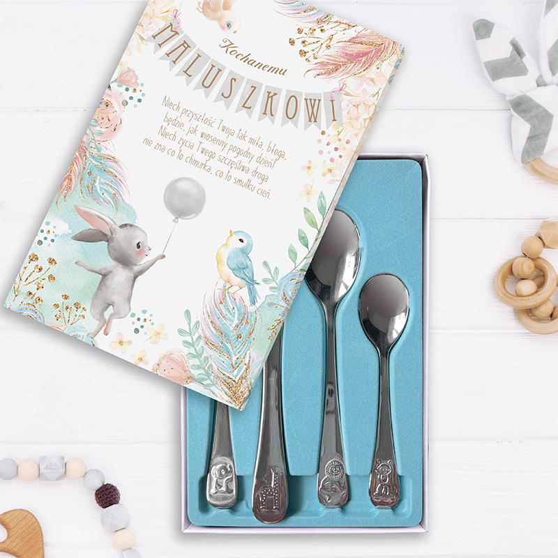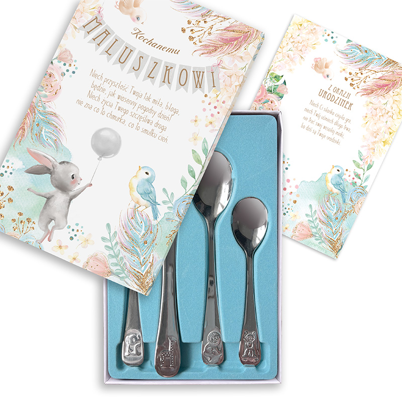 W komplecie znajdują się cztery sztućce: widelec, nóż, łyżka i łyżeczka, ozdobione uroczymi zwierzątkami – słonikiem, żyrafą, lwem i małpką. Każdy element zestawu ma swoje miejsce w eleganckim pudełku, którego wieczko zdobią ilustracje króliczka unoszącego balonik oraz niebieskiego ptaszka pośród barwnych piórek. Dzięki takiemu wykończeniu prezent nabiera niezwykle osobistego charakteru i idealnie podkreśla atmosferę dziecięcych urodzin. Na froncie widnieje napis: