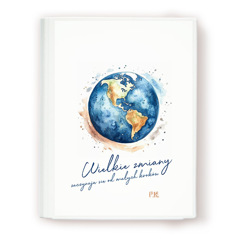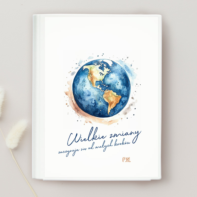 Teczka szkolna na rysunki z personalizacją to sposób na przechowywanie dziecięcych prac plastycznych. Na okładce znalazła się akwarelowa ilustracja Ziemi w odcieniach błękitu, zieleni i brązu, uzupełniona kolorowymi plamkami farby. Towarzyszy jej motywujący cytat „Wielkie zmiany zaczynają się od małych kroków”, a całość uzupełniają inicjały dziecka, które nadają teczce indywidualny charakter.