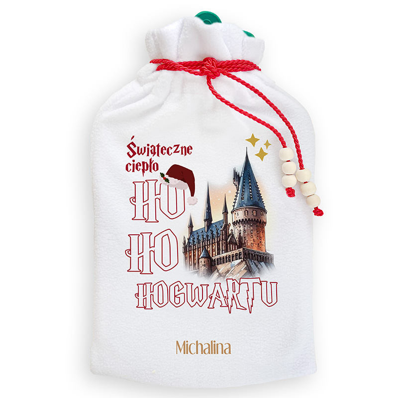 Produkt składa się z klasycznego termoforu wykonanego z trwałej gumy i miękkiego pokrowca z ozdobnym czerwonym sznurkiem zakończonym drewnianymi koralikami. Front w jasnym kolorze został ozdobiony nadrukiem o wysokiej jakości. Całość prezentuje się estetycznie i świątecznie, a detal w postaci czapki Mikołaja i gwiazdek wprowadza przytulny, zimowy nastrój. Personalizowany termofor dla miłośnika Hogwartu na święta doskonale sprawdzi się jako element wyposażenia sypialni, kanapy lub fotela – wszędzie tam, gdzie liczy się komfort i magia.