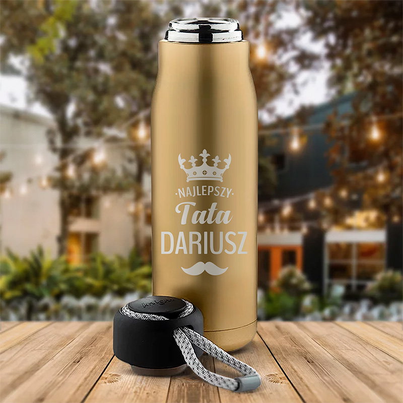 Wykonany ze stali nierdzewnej z podwójnymi ściankami gwarantuje utrzymanie idealnej temperatury napojów przez wiele godzin, zarówno gorących jak i zimnych. Ergonomiczny kształt i matowa, złota powierzchnia zapewniają nie tylko komfort użytkowania, ale również elegancki wygląd. Czarna nakrętka, wyposażona w praktyczny sznurek, umożliwia łatwe przenoszenie termosu. Na złotym, matowym tle termosu umieszczona zostanie personalizacja: napis Najlepszy tata oraz imię taty, elegancko otoczone przez grafikę korony i motyw wąsów, co dodaje gadżetowi męskiego charakteru. Personalizacja sprawia, że termos staje się nie tylko użytecznym przedmiotem, ale także wyjątkową pamiątką.
