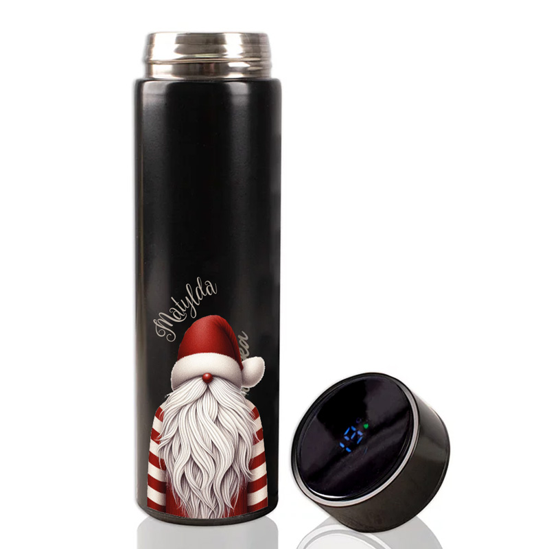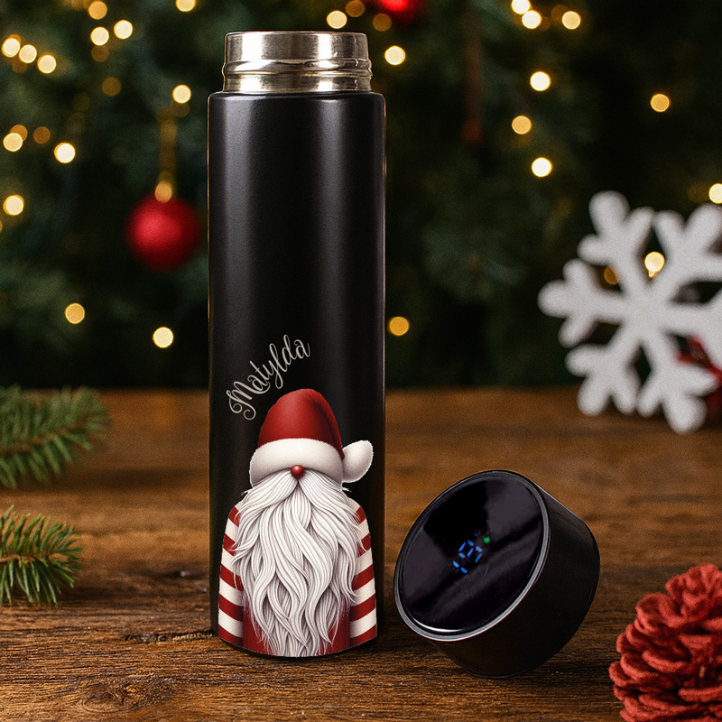 Termos wykonany został z wysokiej jakości stali nierdzewnej i zmieści się w plecaku czy torbie. Na czarnej powierzchni znajduje się kolorowy nadruk z wizerunkiem Mikołaja w czerwonej czapce i pasiastym sweterku. Nowoczesny termos z ekranem LED umożliwia szybki podgląd temperatury napoju – wystarczy dotknąć wieczka, by na cyfrowym wyświetlaczu pojawiła się aktualna wartość w stopniach Celsjusza. Personalizacja imieniem dziecka dodaje produktowi wyjątkowego charakteru.