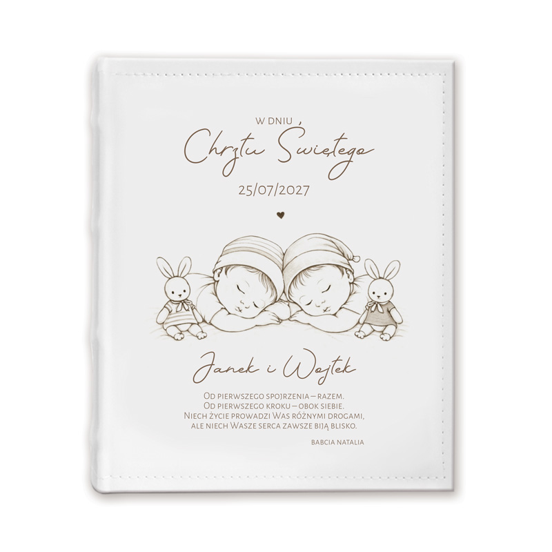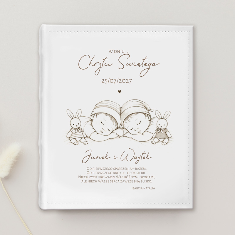 Album posiada solidną, skórzaną oprawę w białym kolorze, co nadaje mu ponadczasowego charakteru. Okładkę zdobi subtelna ilustracja śpiących bliźniąt. Całość utrzymana jest w eleganckim, minimalistycznym stylu, który idealnie wpisuje się w charakter uroczystości Chrztu Świętego. Na okładce umieszczony jest personalizowany nadruk z imionami dzieci oraz datą Chrztu Świętego. Pod gotowymi życzeniami umieszczony jest personalizowany podpis do kogo jest prezent, co nadaje albumowi osobisty i niepowtarzalny charakter.